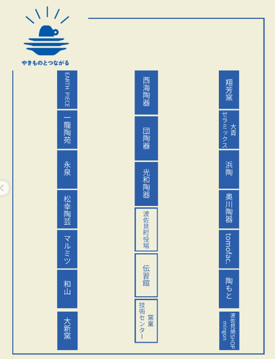 EARTH PIECE、一龍陶苑、永泉、松幸陶芸、マルミツ、和山、大新窯、西海陶器、団陶器、光和陶器、翔芳窯、大貴セラミックス、浜陶、奥川陶器、tomofac.、陶もと、波佐見焼SHOP migon