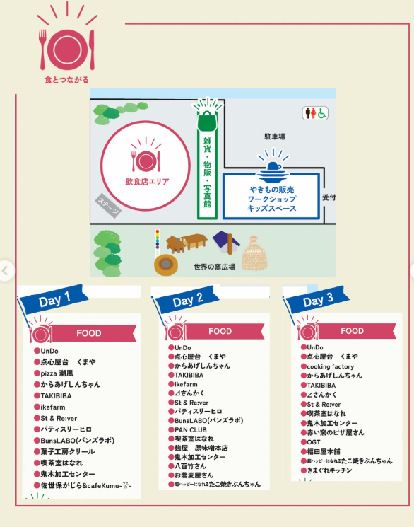 【3日目】UnDO、点心屋台 くまや、cookingfactory、からあげしんちゃん、TAKIBIBA、⊿さんかく、St.&Re:ver、喫茶室はなれ、鬼木加工センター、赤い窯のピザ屋さん、OGT、福田屋本舗、たこ焼きぶんちゃん、きまぐれキッチン